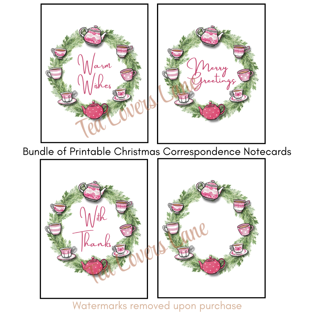 1. 4 Pages with Tea Wreath Note Cards to cut, fold and send saying: "Warm Wishes"; "Merry Greetings"; "With Thanks" and one plain.