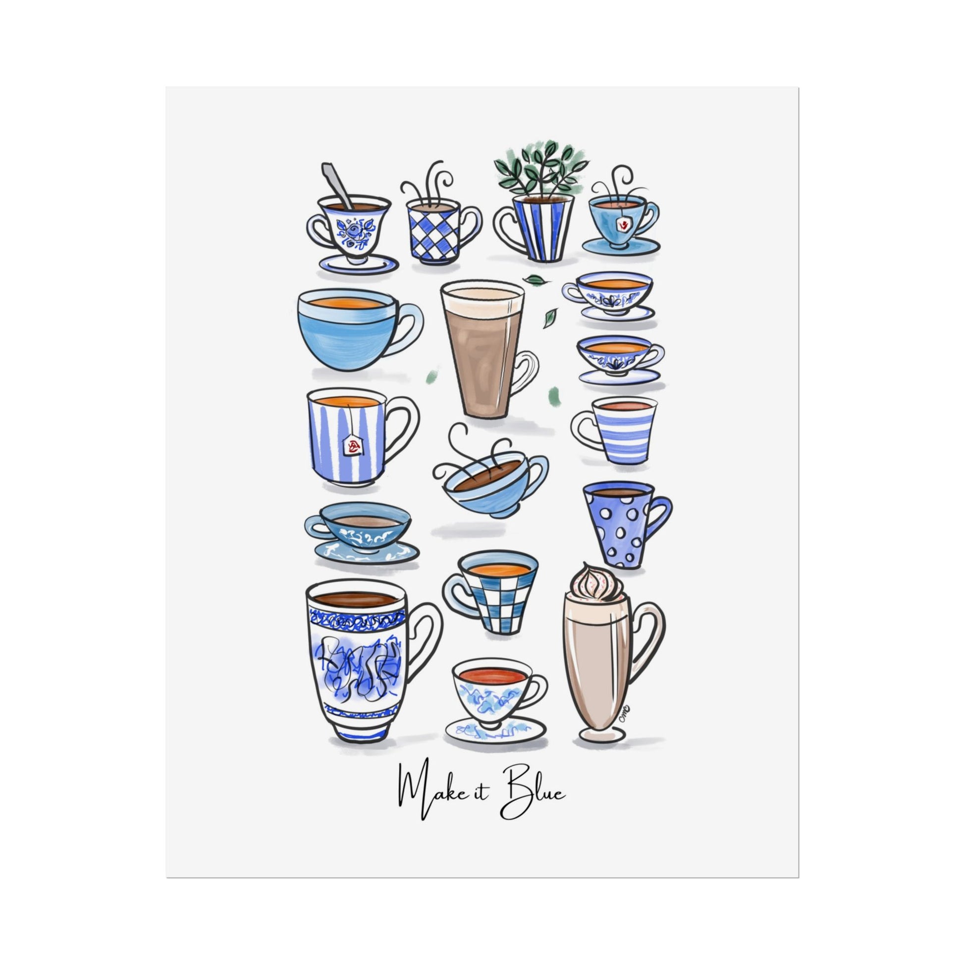 Enjoy my hand drawn Blue and White Teacups wall art - perfect for those who love blue and white decor. Great as a birthday or seasonal gift - or anytime!